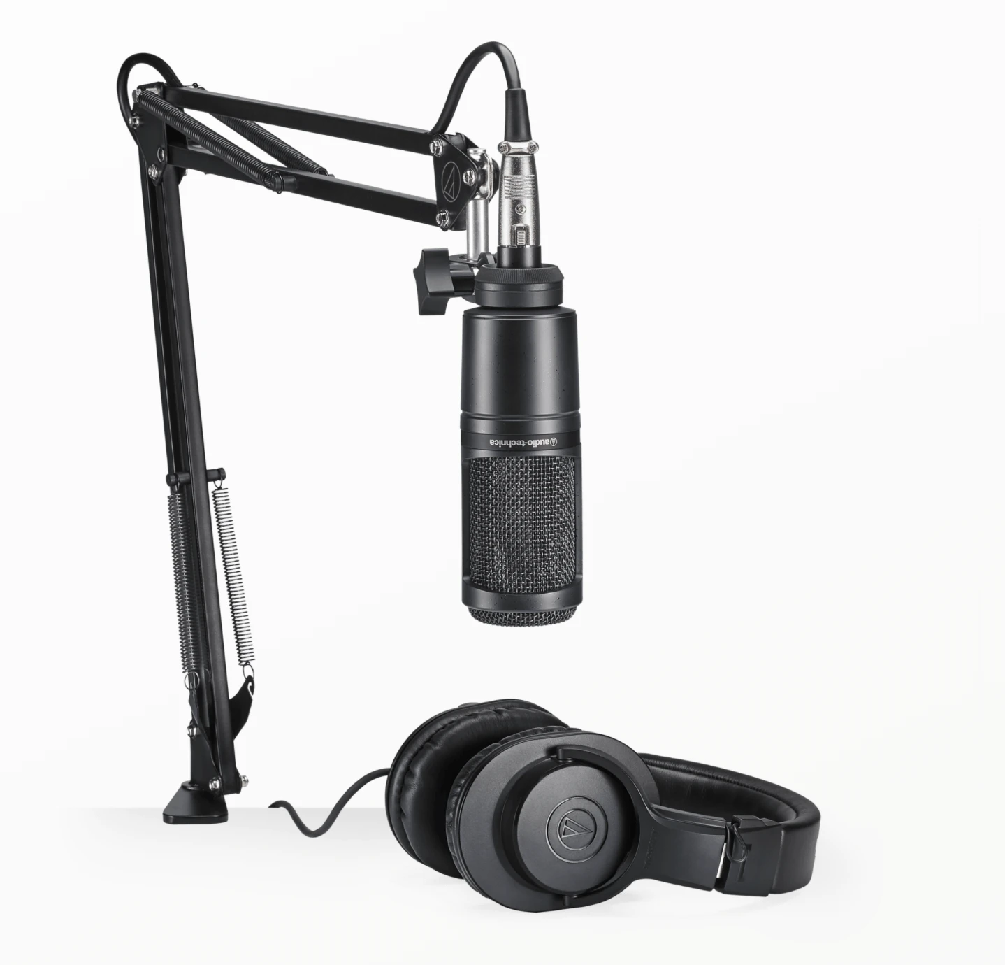 The AT2020PK vocal microphone pack is designed for streamers, podcasters, and other content creators who need a versatile, easy-to-install, easy-to-adjust boom microphone setup. The pack includes an AT2020 cardioid condenser microphone, a pair of ATH-M20x professional monitor headphones and a studio boom arm threaded with a XLR cable.