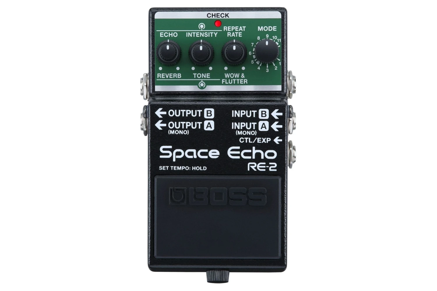The RE-2 squeezes the complete sonic character of the RE-201 into the famous BOSS compact pedal format for the first time. An 11-position mode selector provides access to three virtual tape heads with or without spring reverb, and users can balance the echo/reverb blend with independent level knobs. The RE-2 also offers powerful features such a Wow & Flutter control, extended delay time, selectable carryover, stereo I/O, tap tempo, external control support, and more. Every behavior of the RE-201 is accurately replicated, such as the gradual pitch change that occurs with Repeat Rate tweaks and the runaway feedback that happens when maxing the Intensity knob. And with the expressive Wow & Flutter control, you can conjure all the natural modulation characteristics that are essential to the Space Echo sound.