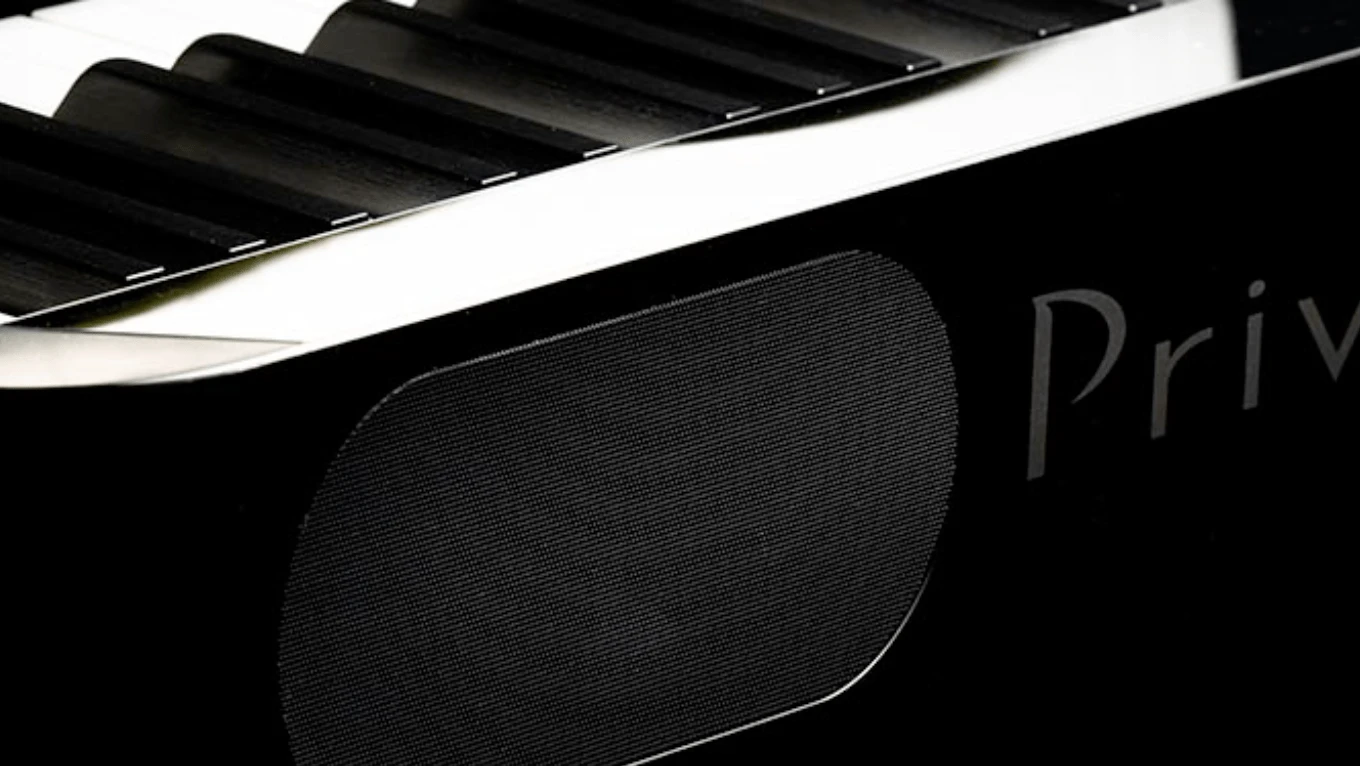 A stereo speaker system delivers crystal-clear sound towards both the player and the audience, and is engineered to sound accurate when facing a wall, placed on a table, or in an open performance space. The speakers project towards the player from subtle ports just above the keys, and towards the audience from rear-facing drivers with a beautifully designed grill. Two headphone jacks allow quiet play at any time.