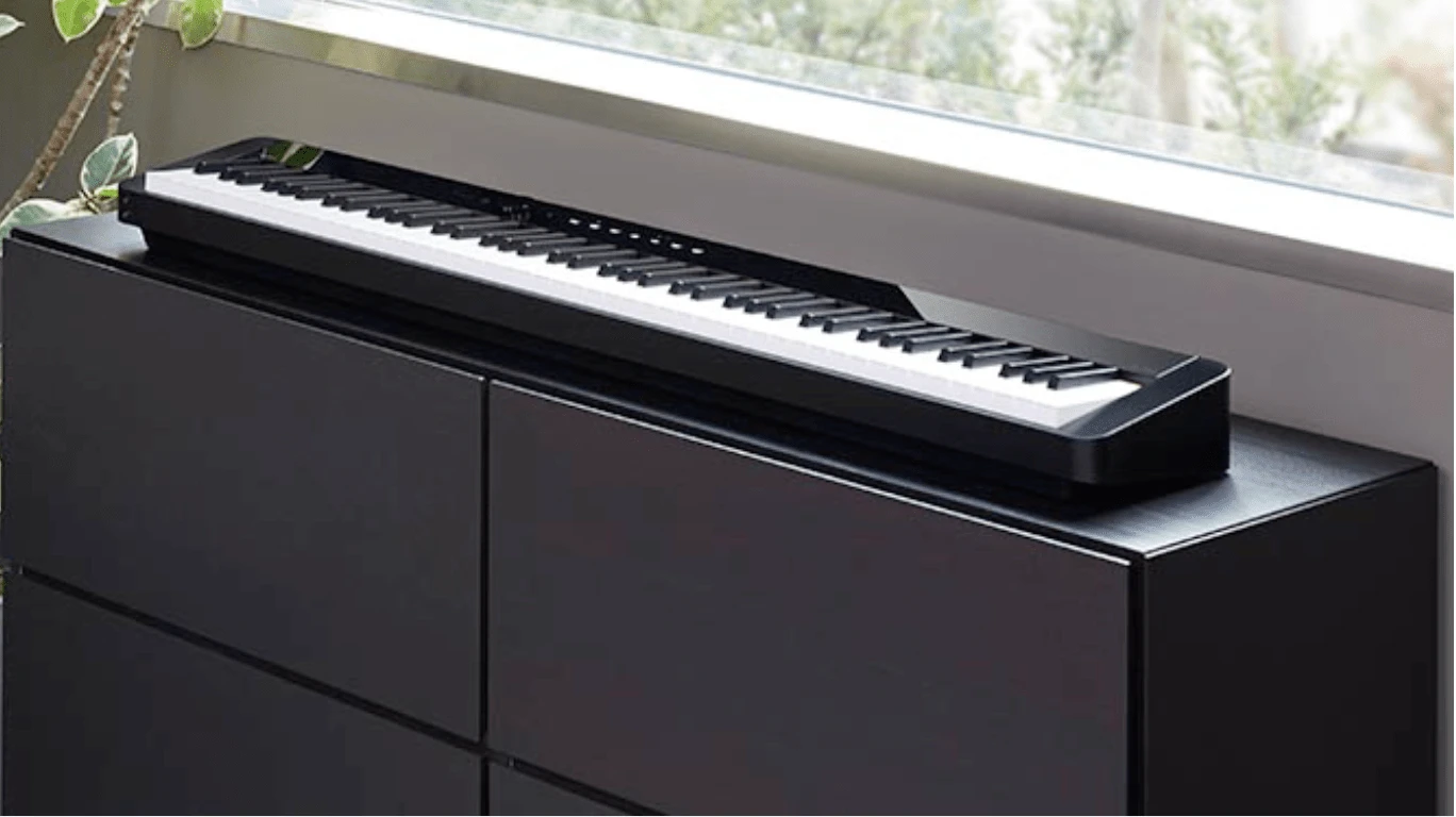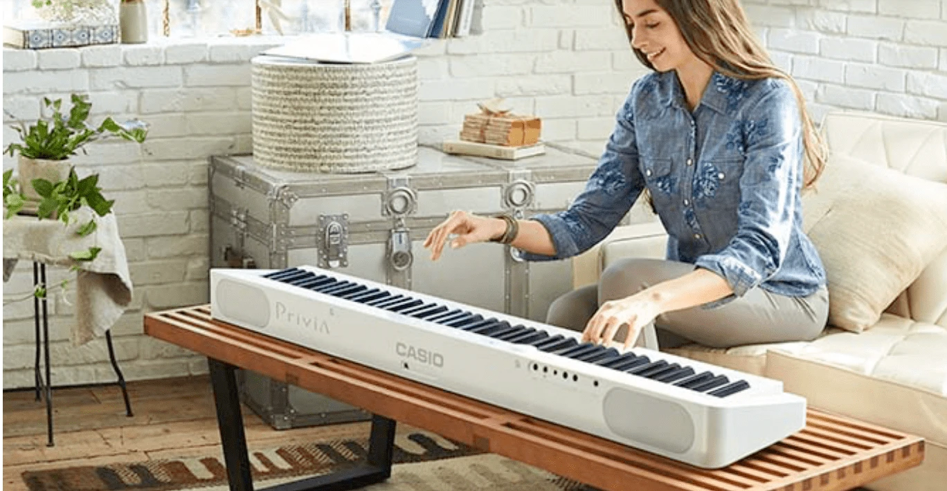 Privia pianos are already known for replicating grand piano sound and feel in a compact package, but the PX-S1000 will make you rethink how portable a piano can be. It’s 43% smaller than previous generation Privias without compromising its true piano experience. It goes anywhere you need a piano: On a table, on a counter, on a desk, on your bed, the list goes on. Weighing under 25 pounds and with optional 6xAA battery power, the possibilities are endless.