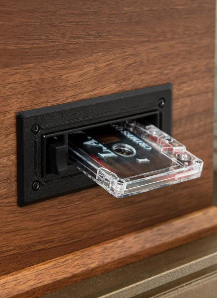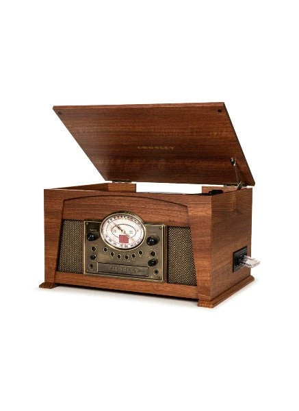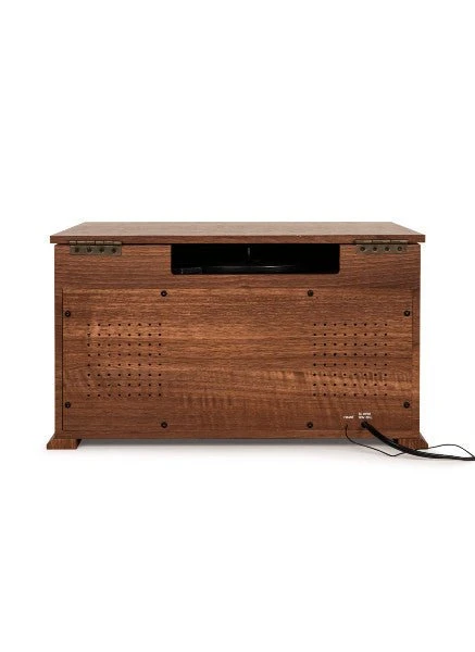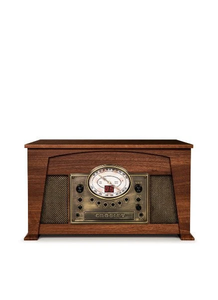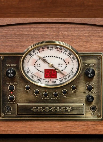 (33 1/3, 45, 78 RPM), cassette player, AM/FM radio, CD player, aux in and a Bluetooth receiver so you can stream your digital music through the built-in stereo speakers. The wood cabinet adds a nostalgic touch and features a matching lid with metal hinge to help keep dust at bay. Built-in stereo speakers sit behind vintage inspired fabric grills and seamlessly blend into the retro design. The Crosley Medley is ready to play!