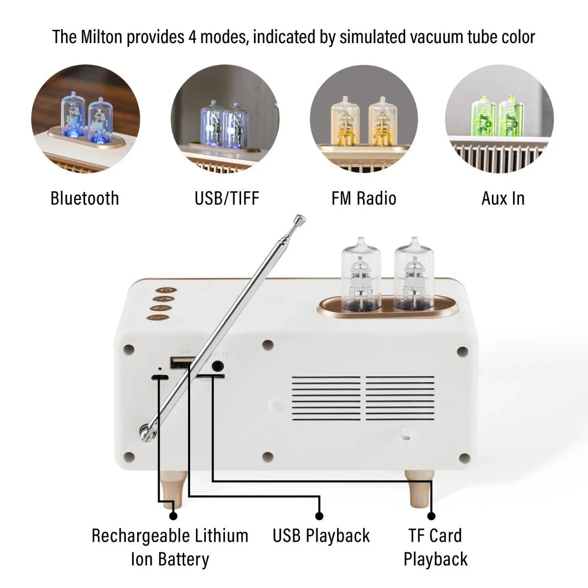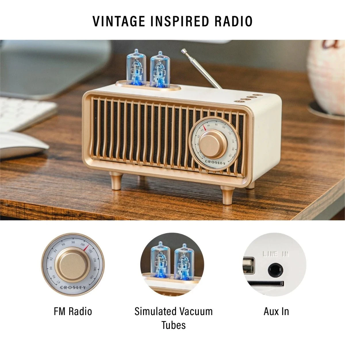 The Crosley Milton Radio will transport you back in time with its vintage appearance but, there is much more to it than good looks. The simulated vacuum tubes are just as functional as they are aesthetic by indicating what mode you are in by changing color. The Milton Radio offers FM radio, an aux input, USB Playback, AND you can stream music via Bluetooth through its built-in speaker. Listen to your favorite broadcast stations and more with the Milton Radio from Crosley.