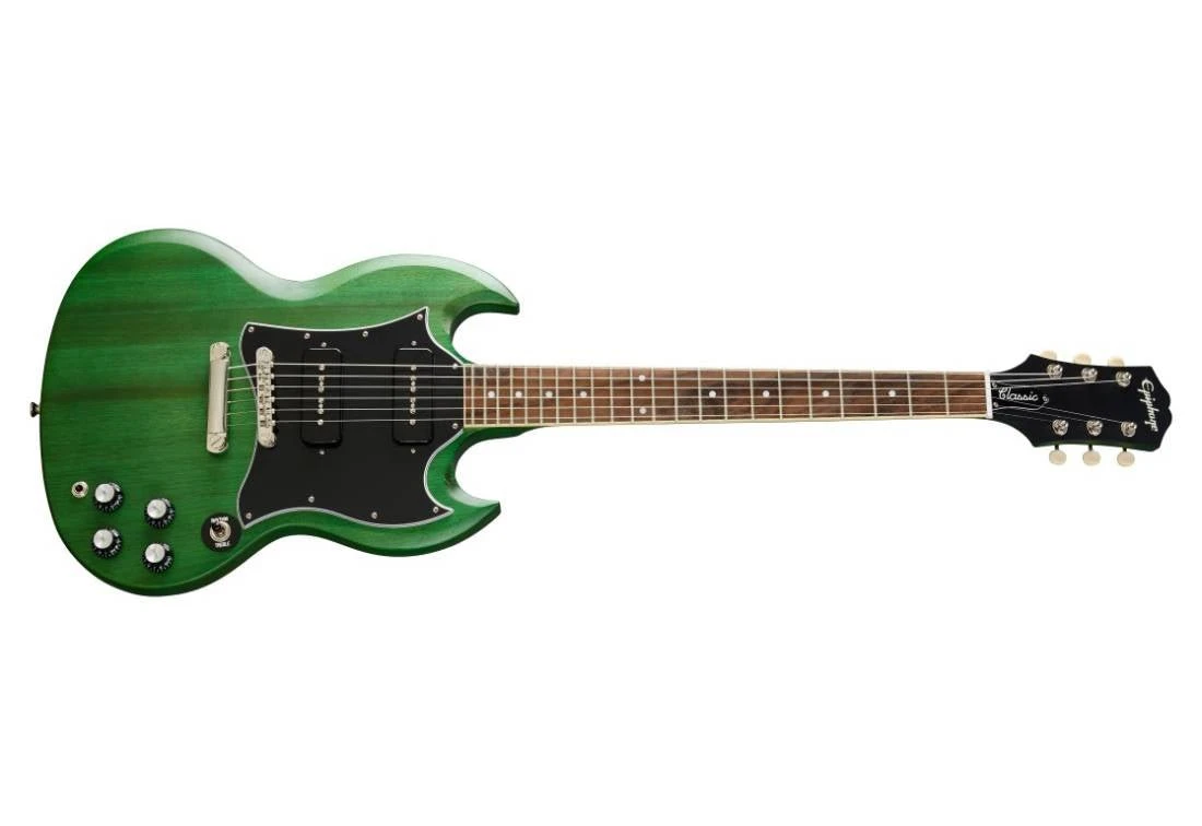 The Epiphone SG Classic Worn from the new Inspired by Gibson Collection offers fans the legendary SG solid body electric in a “worn” open grain finish. Powered Epiphone P-90-PRO™ soap bar single coil pickups.