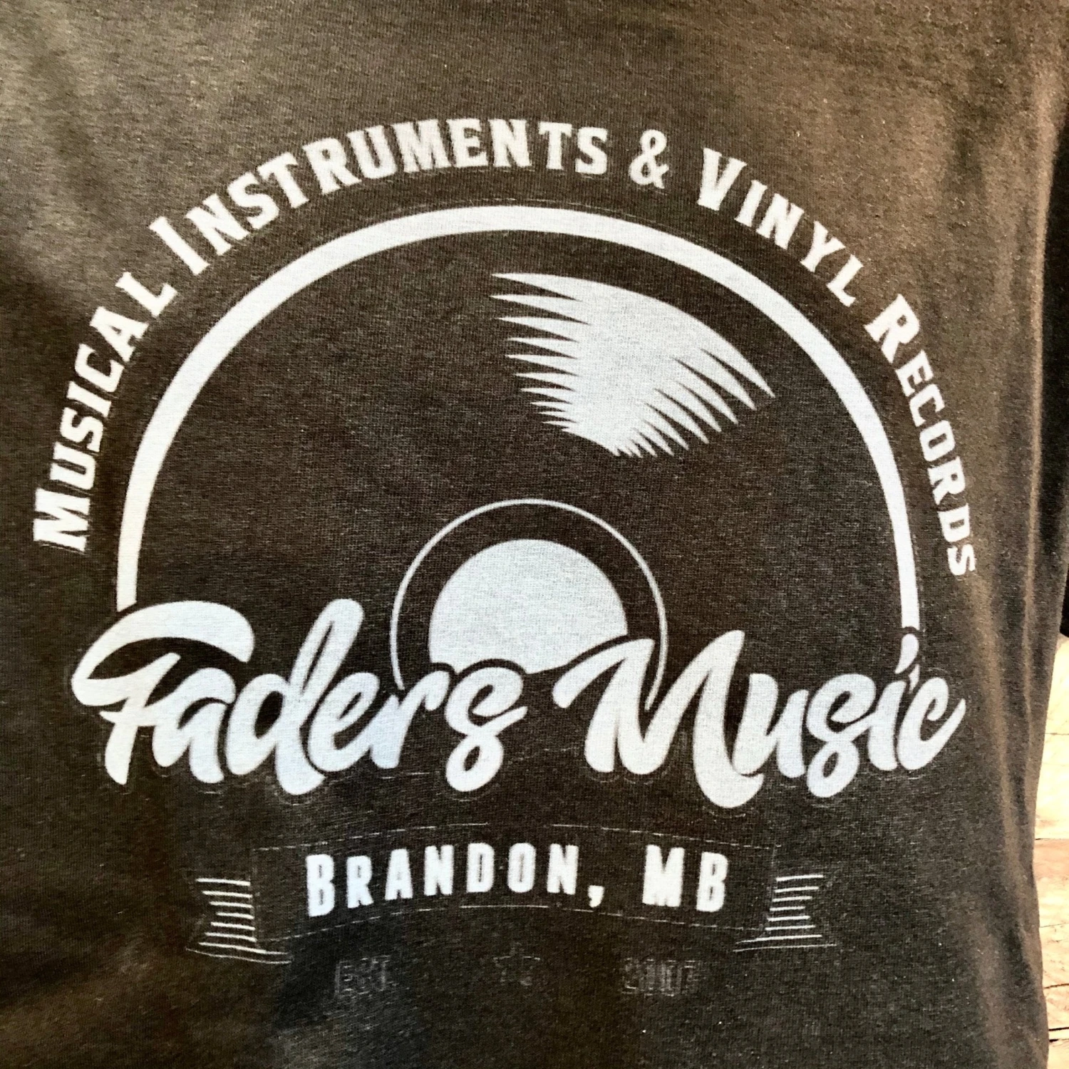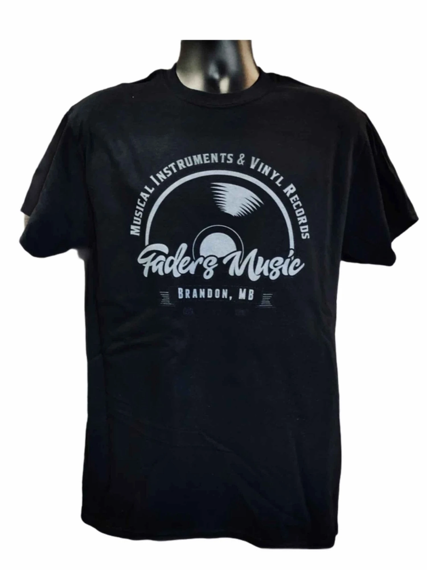Stylized Vinyl Record Faders T-Shirt in blackout finish. Dark grey print on a comfortable black Tee.