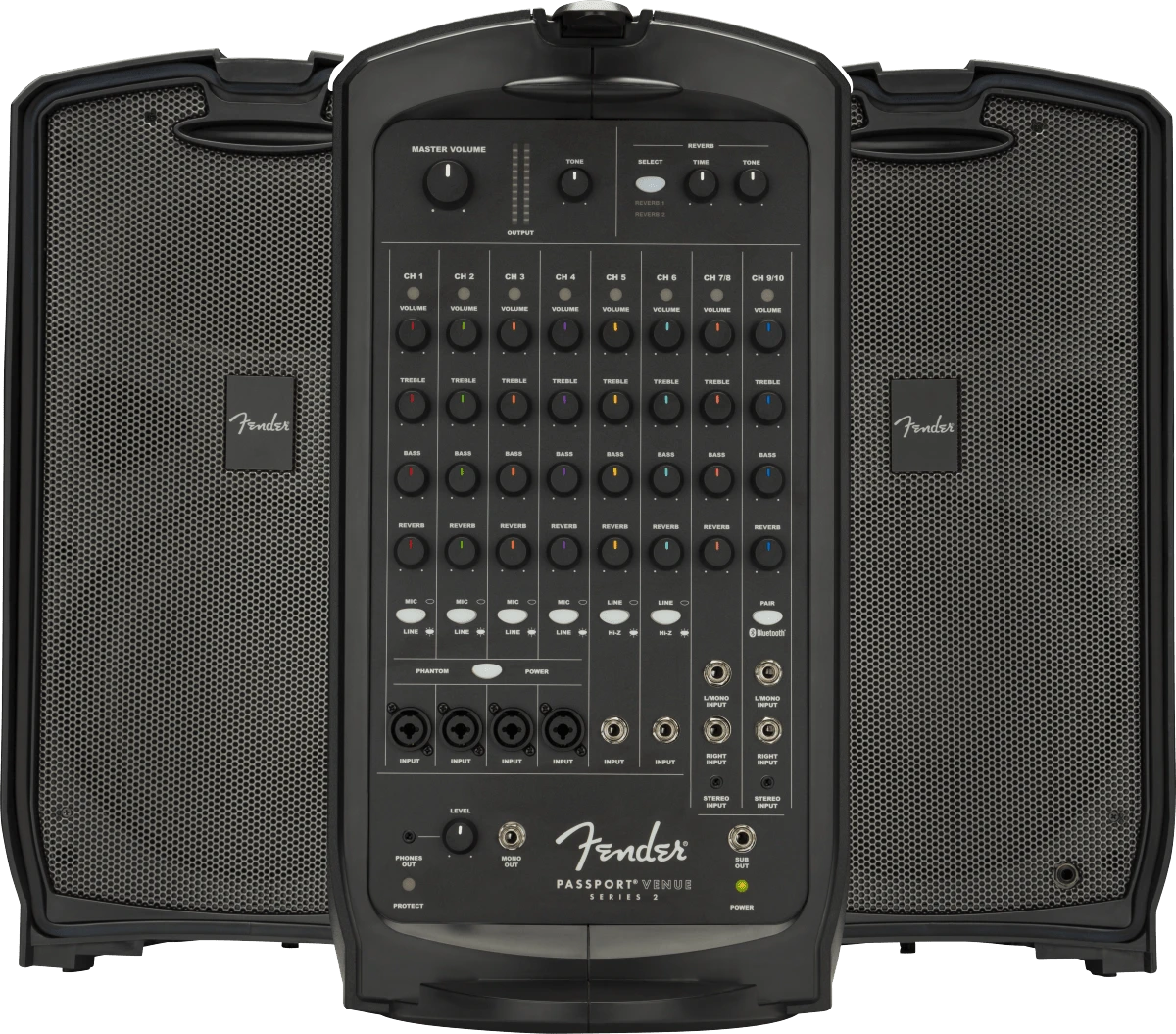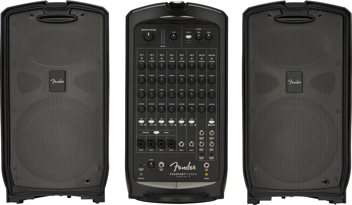Maximize the sonic punch of any large performance with the Passport Venue Series 2 portable sound system. Featuring Bluetooth® audio streaming and XLR ¼” combination jacks for increased connectivity, Passport® Venue Series 2 has full-range speakers, versatile features, friendly front-panel controls and 600 watts of power for strong, clear and reliable Fender sound ideal for larger venues and occasions—including band and DJ gigs; education, sporting and worship events; meetings, seminars and presentations and more.
