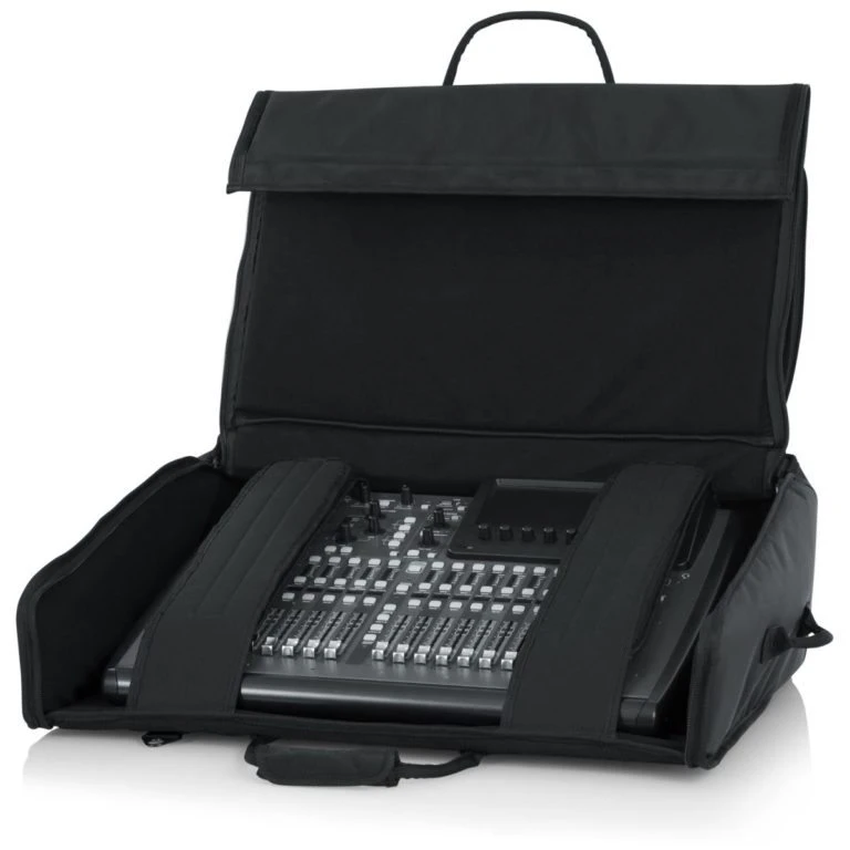 Gator Cases G-MIXERBAG-2621 large format mixer bag is designed to provide a perfect fit for mixers up to 26” x 21” x 8.5”. this mixer bag features a sleek, black textured nylon exterior accented with a touch of “Gator red”. the unique angled shape of the bag contours the shape of the mixer to provide a snug fit and keep the mixer from sliding around in the bag during transport.