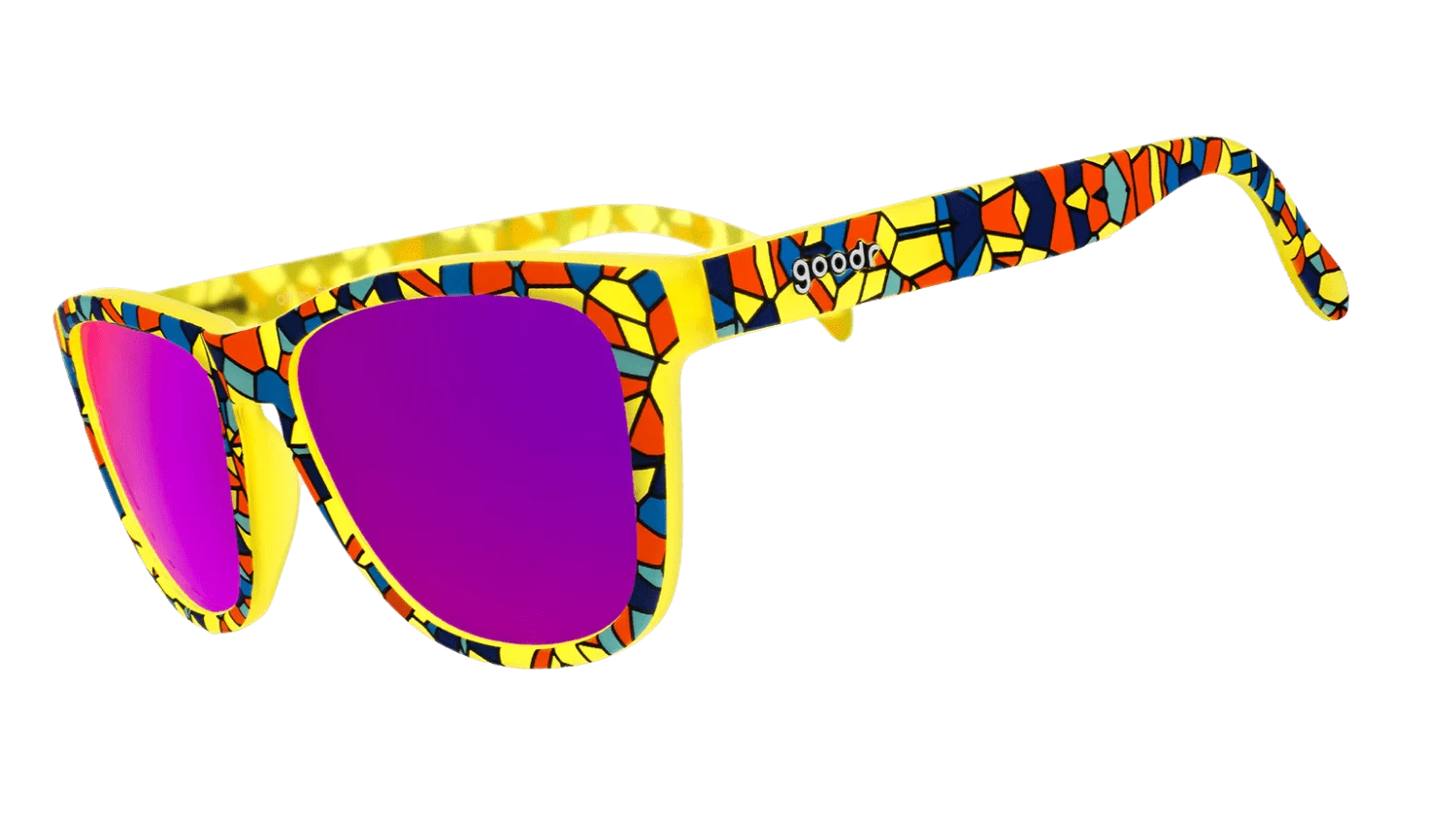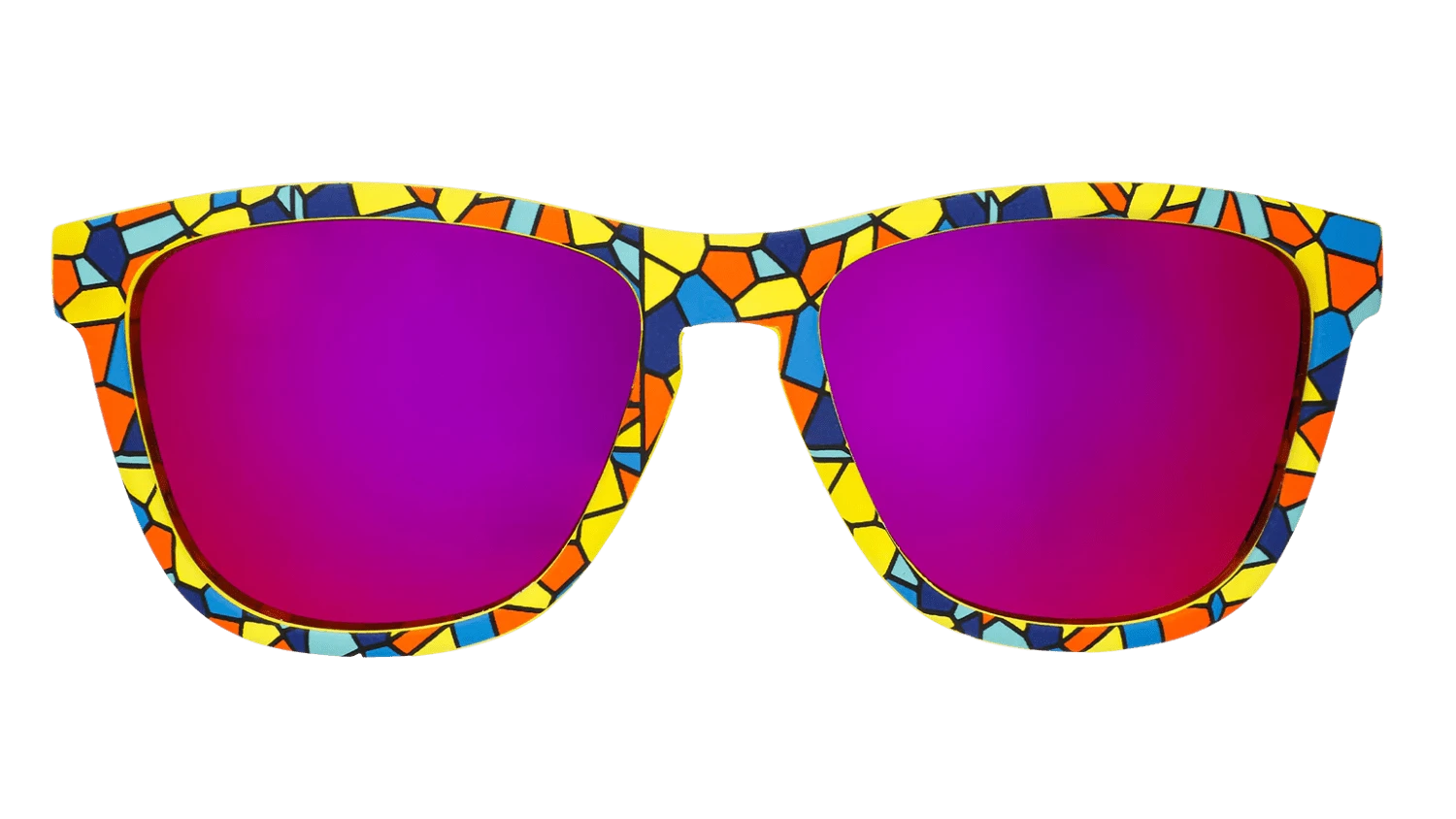 A goodr employee accidentally books a trip to Shatter Island, a mysterious tropical “resort” where no one believes they work for a flamingo CEO. During art therapy, they create these stained glass-inspired OG sunnies w/ rose reflective lenses.