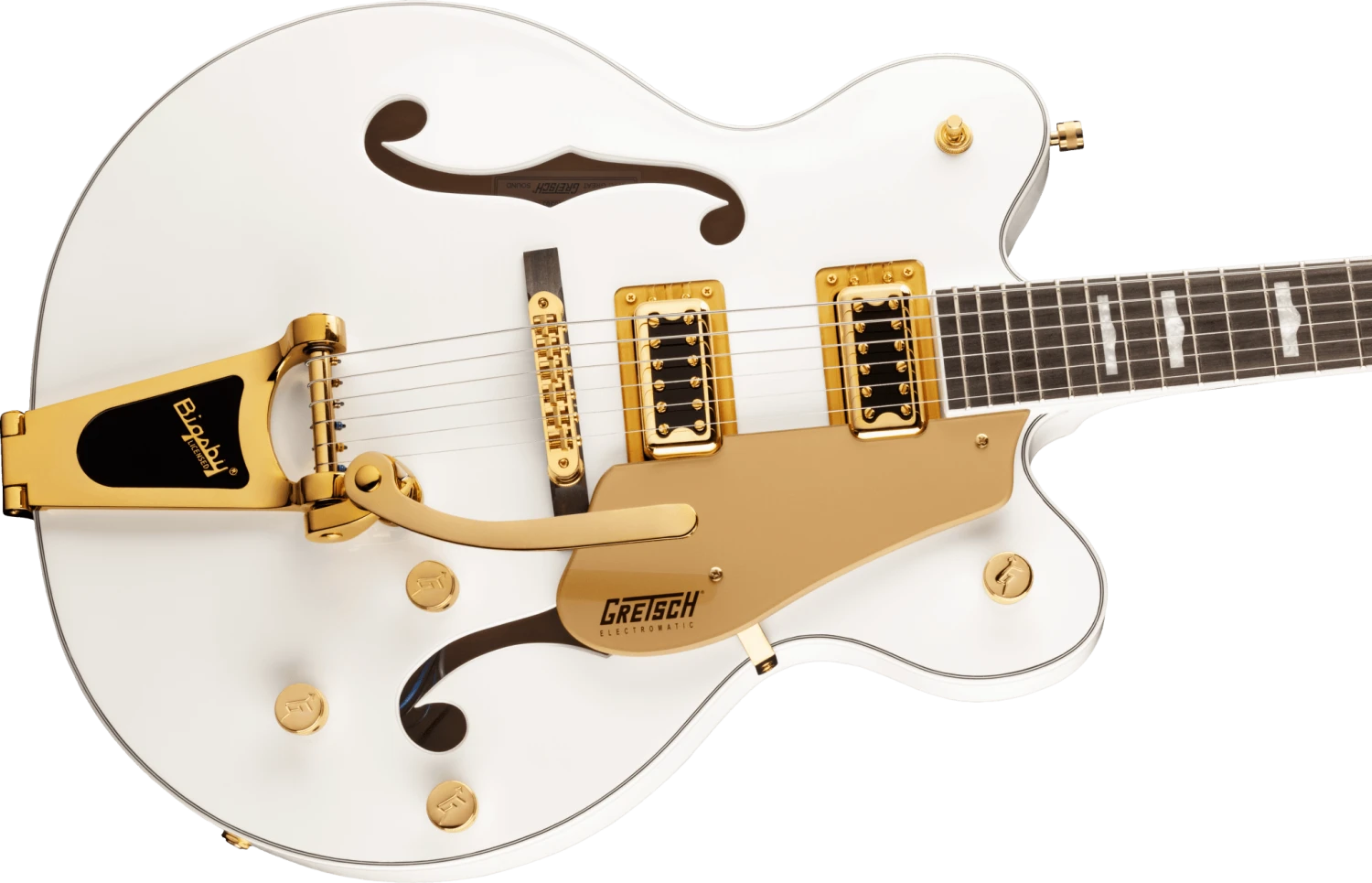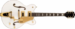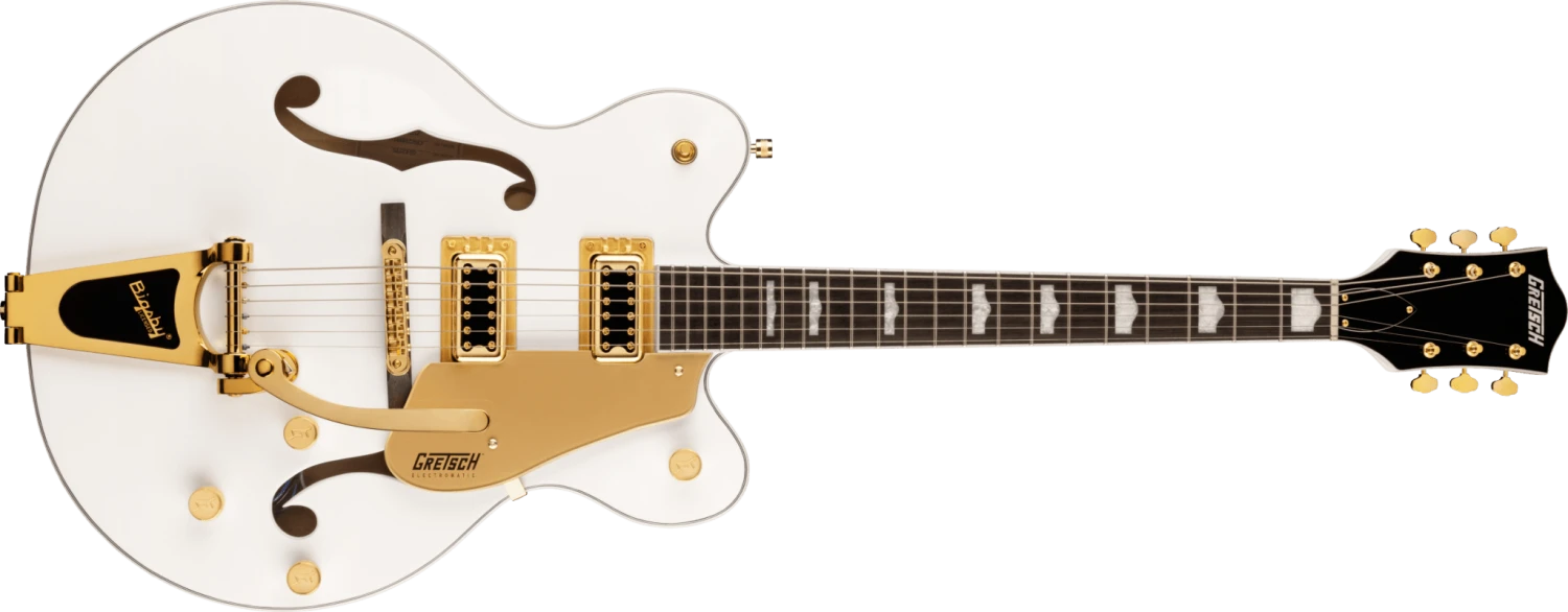 The G5422TG Electromatic® Classic Hollow Body Double-Cut with Bigsby® and Gold Hardware features a laminated maple body with vintage-inspired perimeters and refined arches, as well as all-new trestle block bracing to help reduce unwanted feedback. By increasing rigidity and contact between the top and back of the body, the new trestle block design also results in the sound having a faster attack with more focus, snap, and increased sustain. Coupled with all-new FT-5E Filter’Tron™ pickups, this hollow build’s voice explodes with huge full-bodied punch, classic chime and enhanced presence, clarity and note definition.