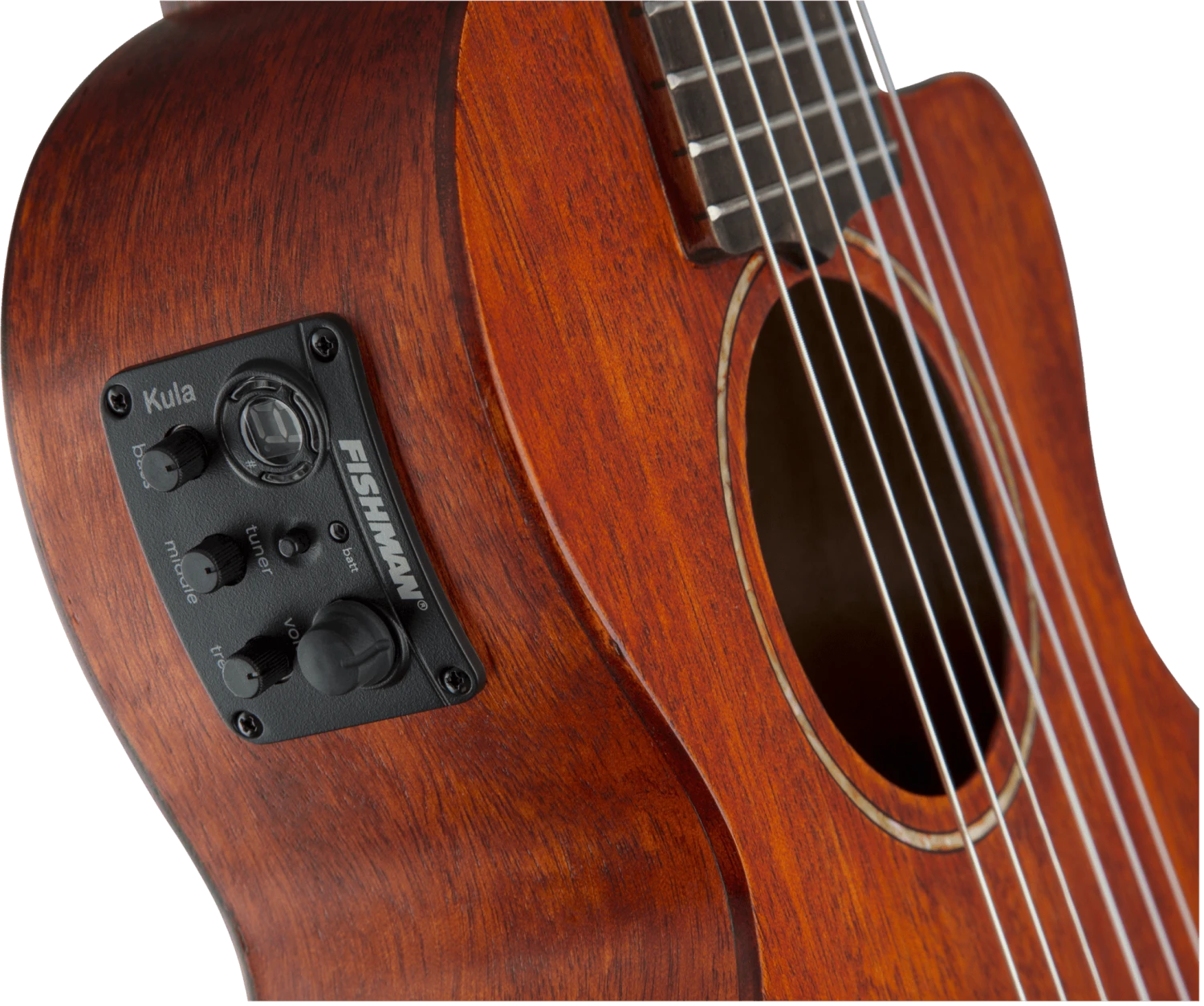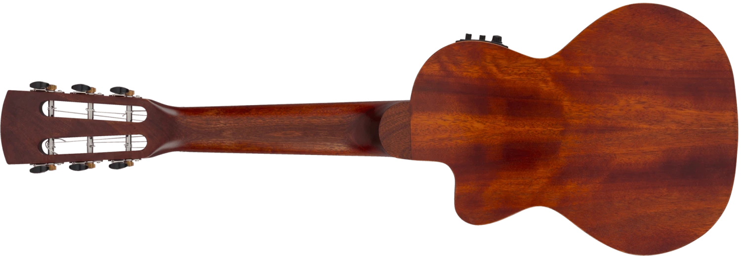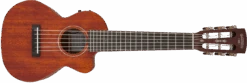 Its features include a 17″ scale and convenient cutaway, Fishman® Kula pickup/preamp system, solid quartersawn mahogany top, mahogany back and sides, one-piece mahogany neck, 19-fret ovangkol fingerboard with “snowflake” position markers and bone nut, ovangkol bridge with bone saddle, Grover® Sta-Tite™ tuners and a deluxe fitted gig bag.