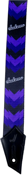 This Black poly guitar strap features a Jackson® double V pattern with leather ends also in the shape of the headstock. Available in four color combinations — Black with White Double Vs, Black with Red Double Vs, Black with Blue Double Vs and Black with Purple Double Vs.
