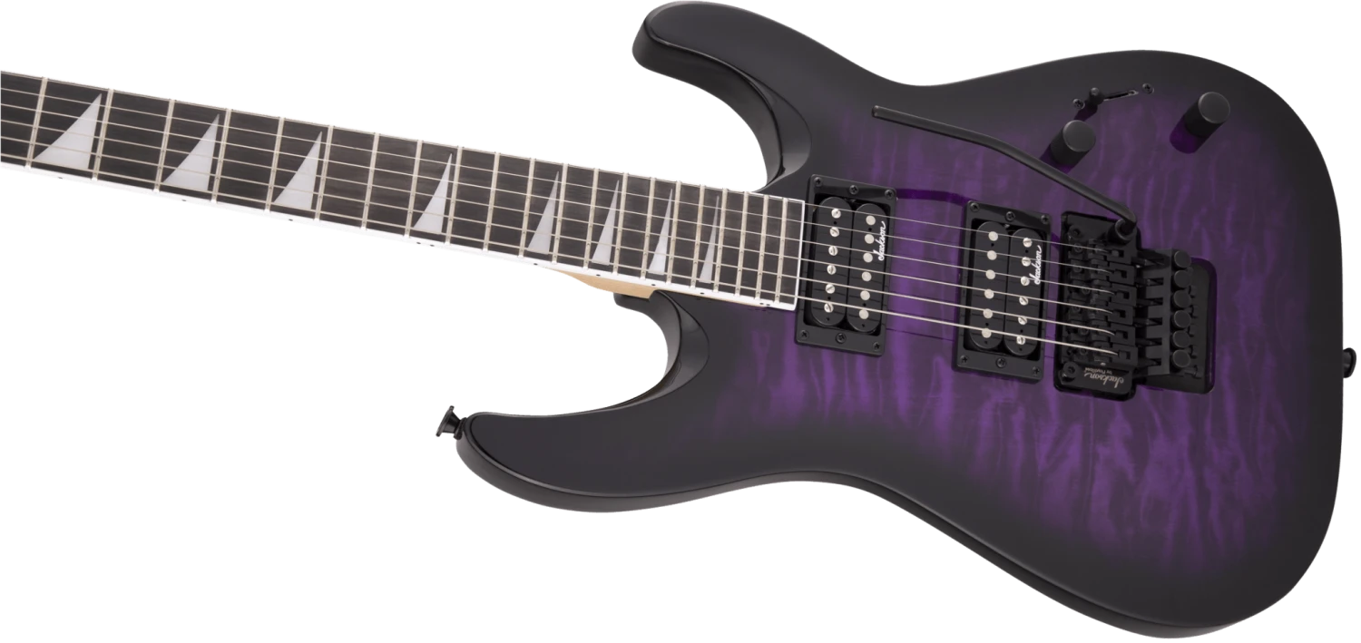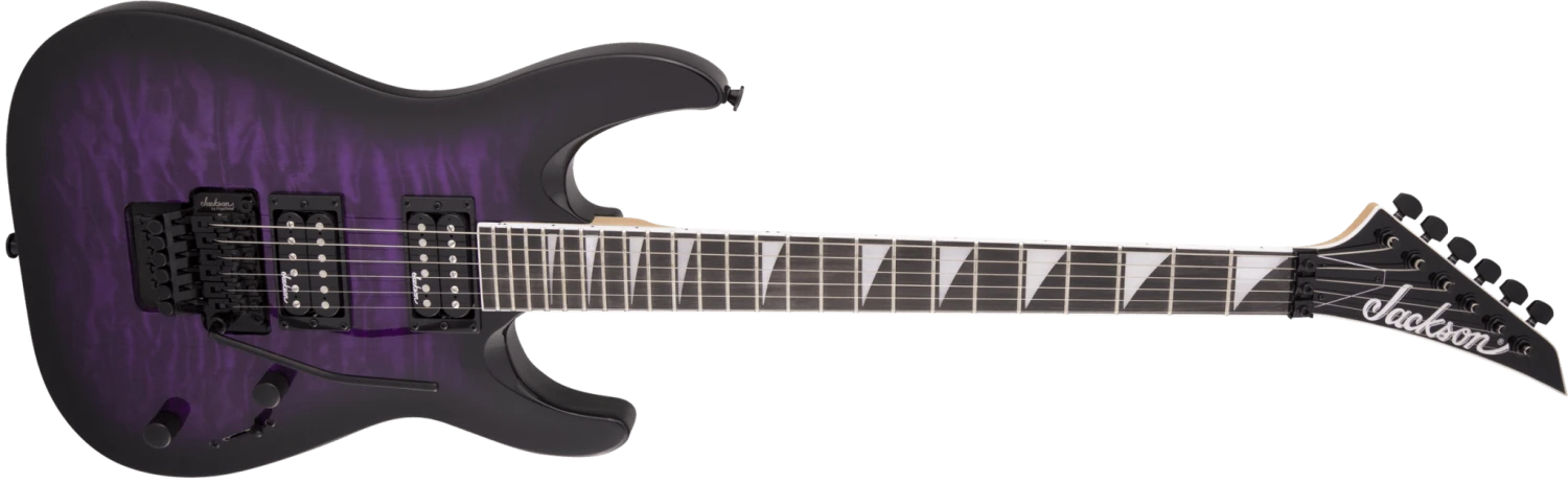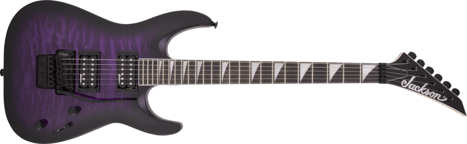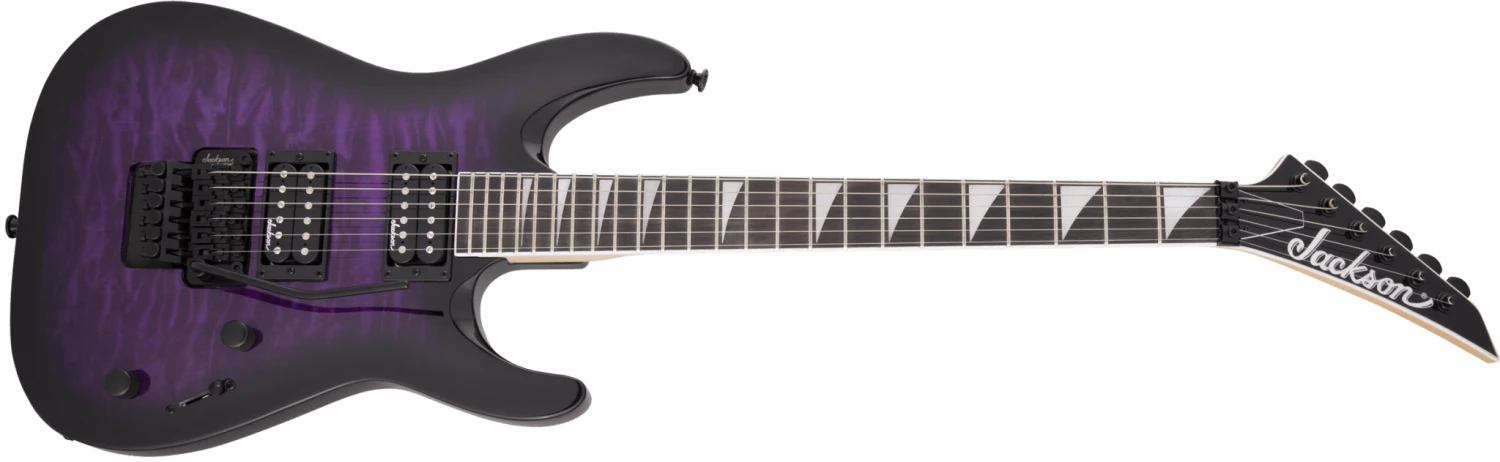 Sporting classic Jackson style, the JS32Q DKA is wrapped in Dark Sunburst, Transparent Black, Transparent Blue, Transparent Green Burst or Transparent Purple Burst finishes with our signature pointy black headstock and all-black hardware, including the standard strap summarys and sealed die-cast tuners.
