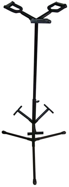 Triple guitar stand that safely supports three guitars on a solid tri leg base and features sturdy safety lock and padded black foam.