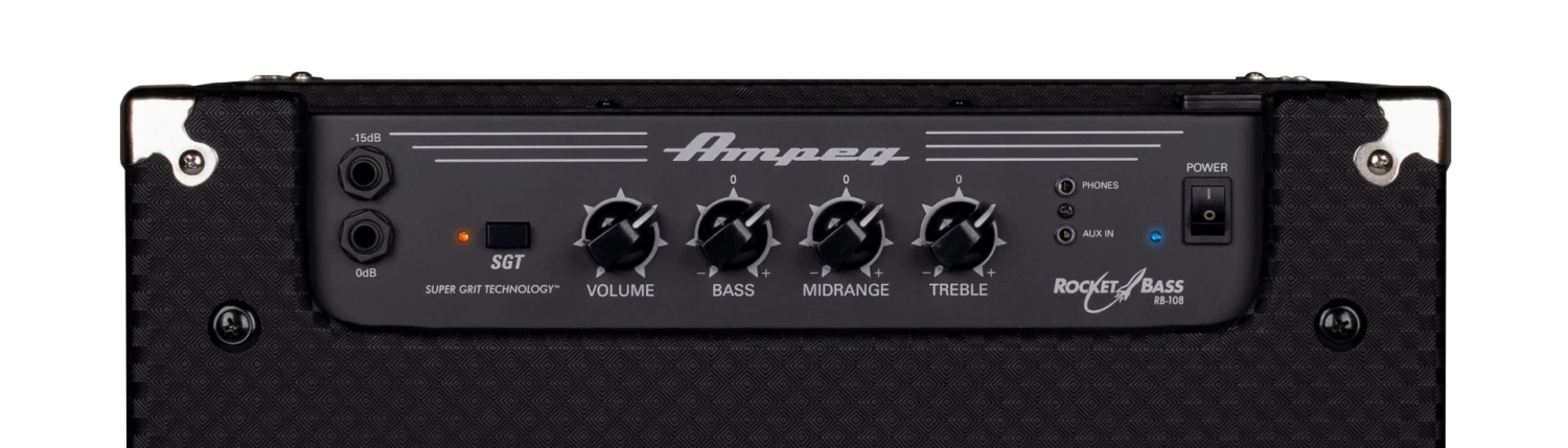 Ampeg’s 100-watt RB-112 features a custom 12″ Eminence® speaker and is a perfect choice for practicing, performing, and recording. Classic Ampeg 3-band EQ and Ultra Hi/Ultra Lo switches, combined with the new Super Grit Technology™ overdrive circuit, enable you to easily dial in legendary Ampeg tone. Additional features include an auxiliary input, a headphone output, an effects loop, and an XLR output that provides a professional connection to a P.A. or recorder.