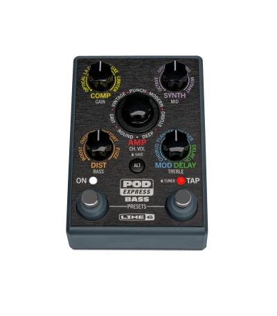 POD Express Bass is an ultra-portable bass amp and effects processor that enables bassists to take their tones wherever they choose, Simple controls make it easy to use, while models derived from the HX family of processors ensure exceptional sound quality and authentic feel. POD Express Bass gives bassists seven amps, seven cabs, and 17 distortion, compression, synth, modulation, and delay effects – including a looper- and it may be powered by three AA batteries (included) or an optional 9-volt power supply. Additional features include stereo outputs, tap tempo, a tuner, a noise gate, a headphone output, and a USB-C audio interface with re-amping capabilities. Add on optional expression pedal for volume control, or up to two footswitches to select presets or turn effects on and off.